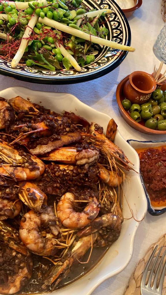 - Als het geheel gekarameliseerd is, kun je de rest van de wijn en de linzen toevoegen. Laat dit op zacht vuur gaarkoken (zie kooktijd van de linzen) en voeg 5 minuten voor het einde van de kooktijd de gamba’s toe. Zet het vuur hoog en ‘wok’ de gamba’s in de linzensaus. Als de gamba’s mooi roze zijn, is het gerecht na 5 minuten klaar.