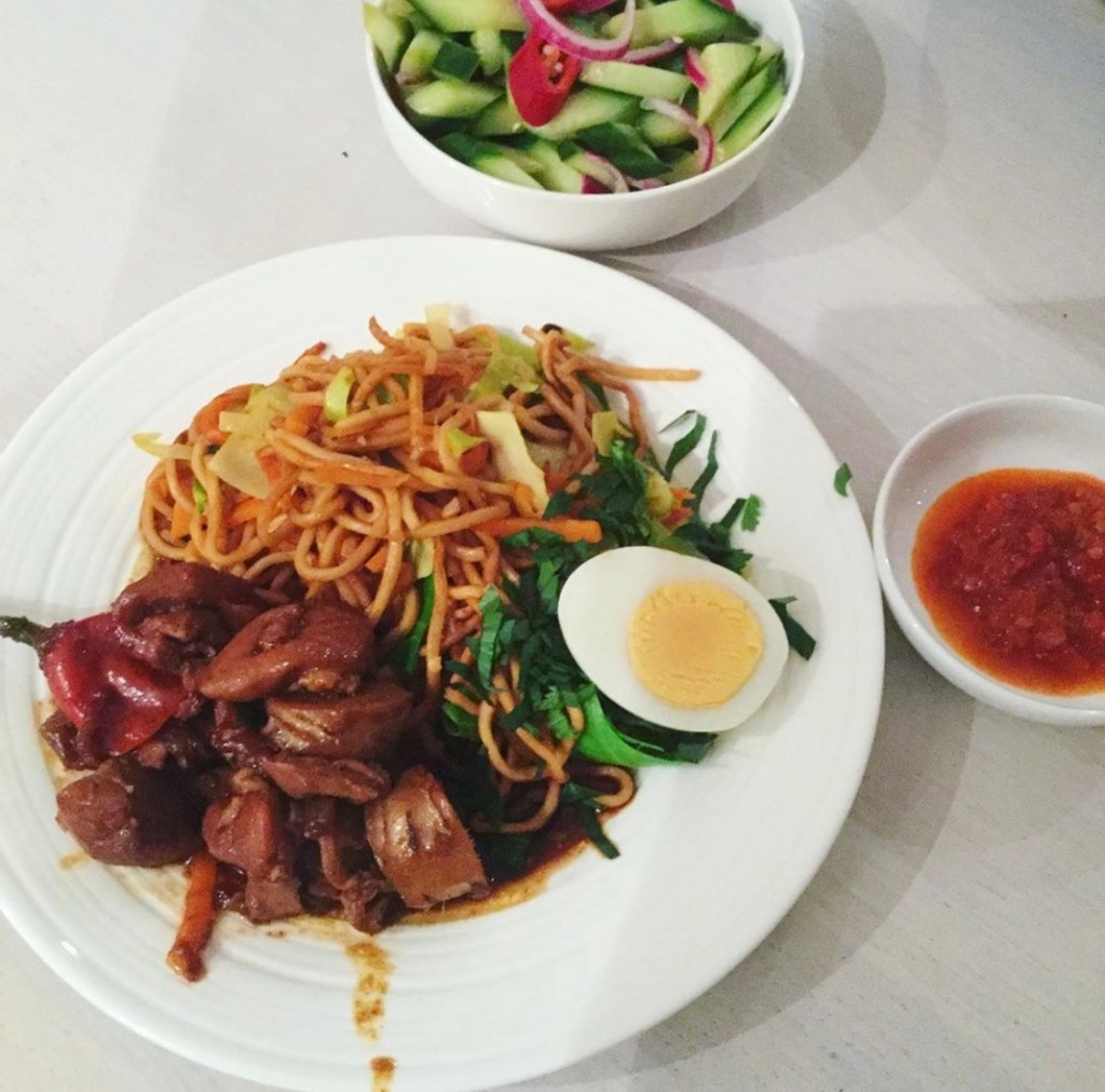 Fruit alle bovengenoemde ingrediënten (op de ketchup na) aan in de olie op laag vuur, ca. 5 minuten. Voeg de spaghetti en een flinke scheut ketchup toe. Naar smaak kan nog extra ketjap toegevoegd. Voor het serveren de fijngesneden selderij toevoegen.